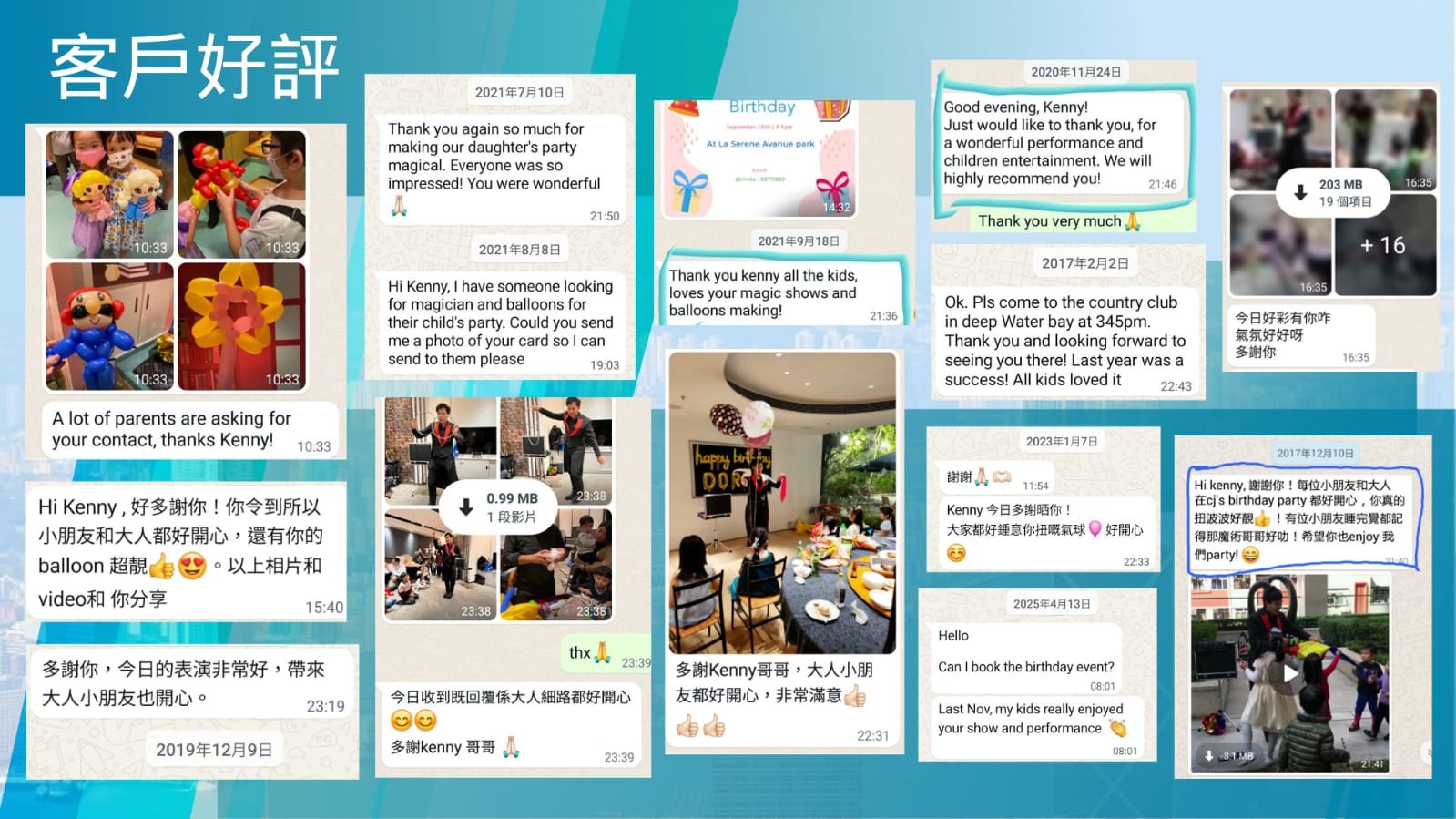 無論是企業年會、學校活動、兒童派對還是慈善義工服務,Kenny 都以專業的態度和創意的表演方案,確保每一場活動都成為嘉賓們難忘的回憶。